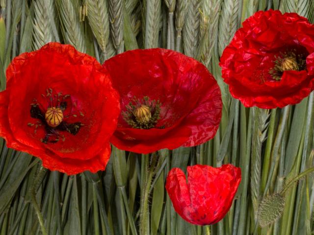 Wallpaper Red poppy flowers on green spikelets of wheat