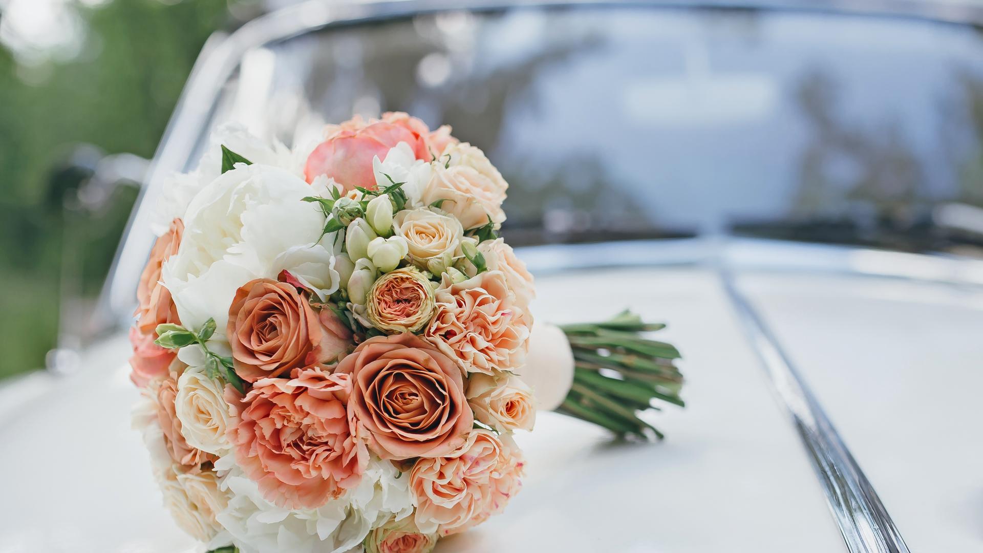 Wallpaper A wedding bouquet of roses lies on the car