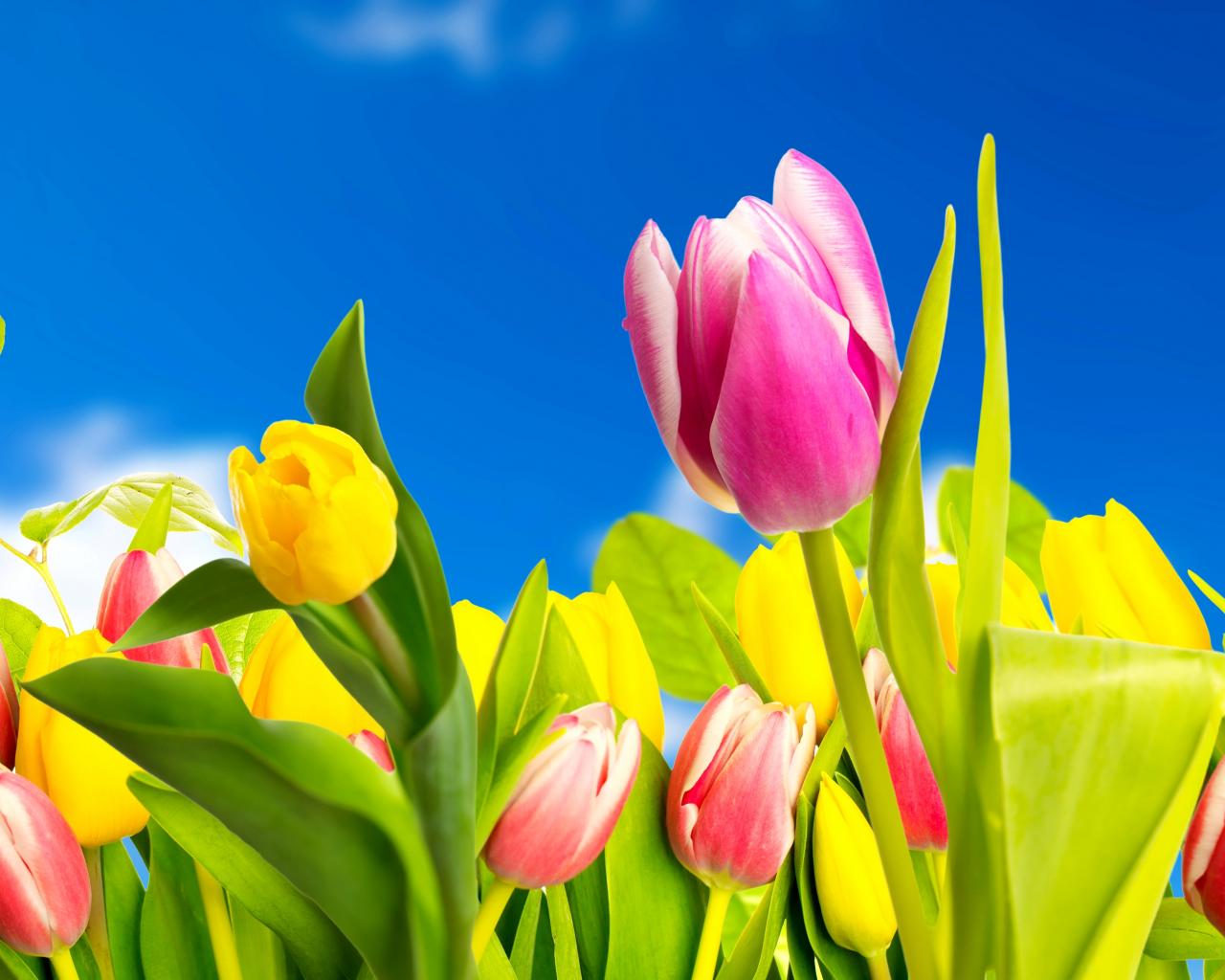 Wallpaper Yellow and pink tulips against the blue sky