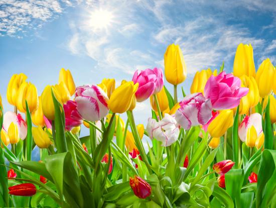 » Wallpaper Multicolored tulips against the blue sky with the sun