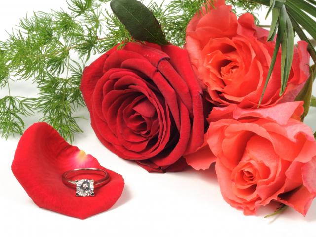 Wallpaper Three red roses with a beautiful ring with a diamond