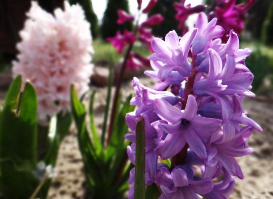 Wallpaper Flowerbed with spring hyacinth flowers under the spring sun