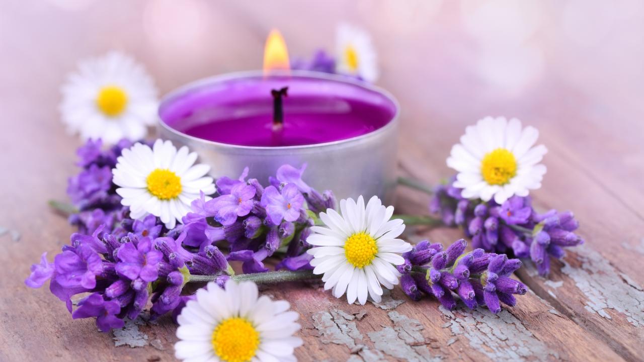 Wallpaper Lighted candle with chamomile and lavender flowers