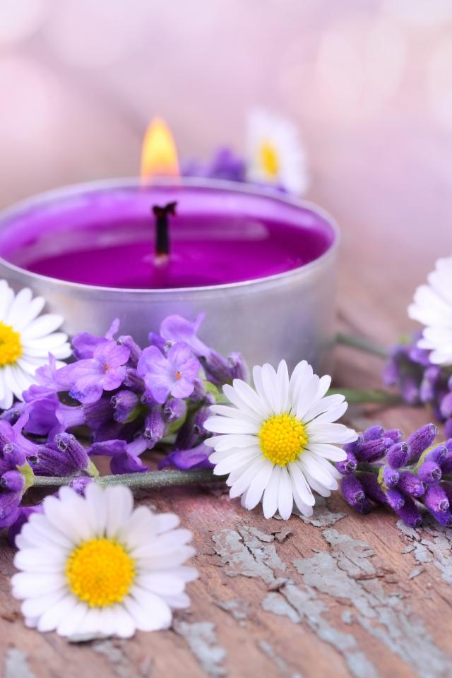 Wallpaper Lighted candle with chamomile and lavender flowers