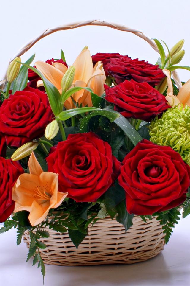 Wallpaper Basket with flowers of a red rose and lilies
