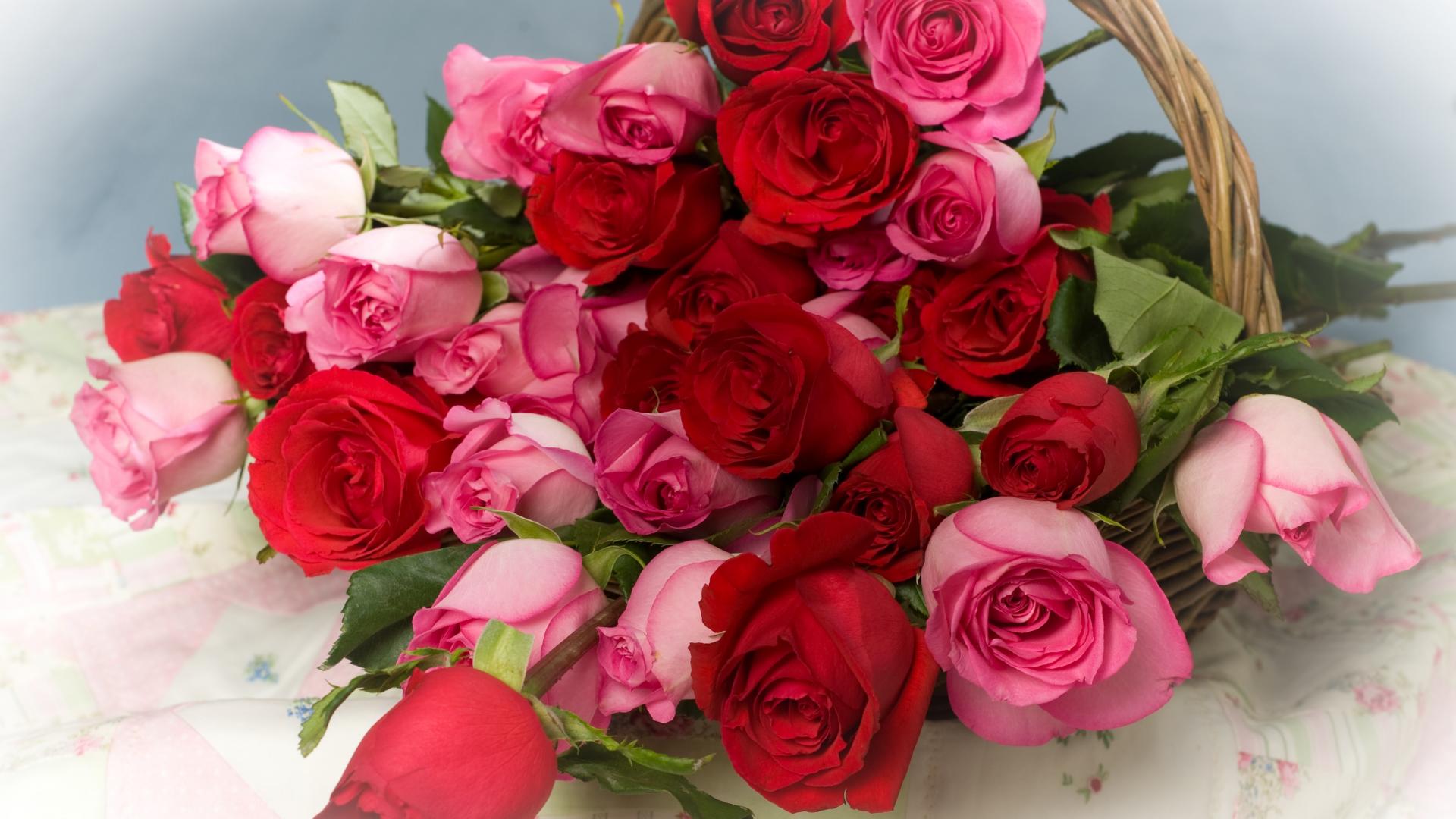 Wallpaper A huge bouquet with pink and red roses in a basket on a white background