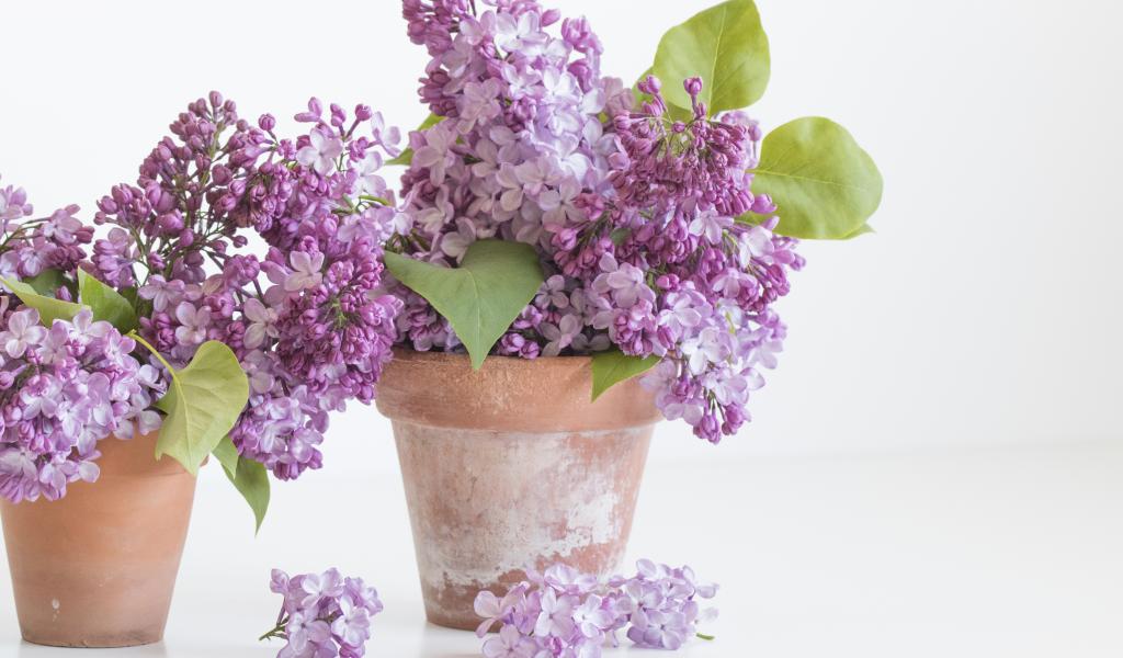Wallpaper Lilac flowers in pots on a white background