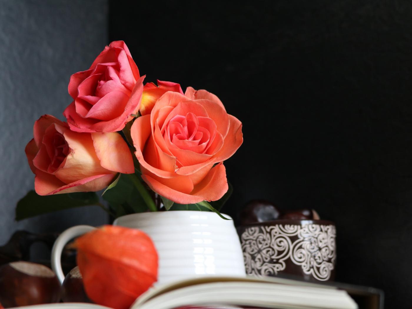 Wallpaper A bouquet of roses in a vase on a table with a book