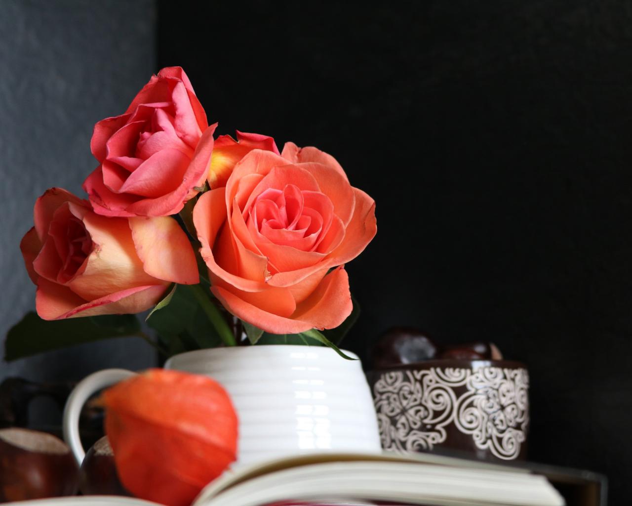 Wallpaper A bouquet of roses in a vase on a table with a book