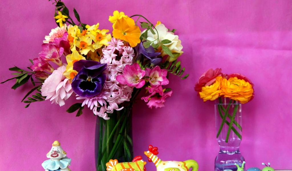 Wallpaper Bouquet of flowers in a glass vase on a violet background
