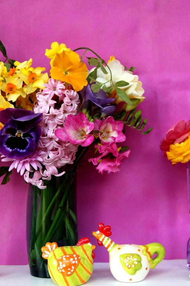 Wallpaper Bouquet of flowers in a glass vase on a violet background