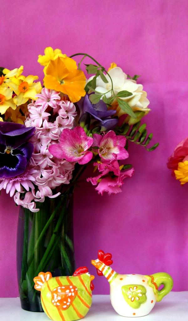 Wallpaper Bouquet of flowers in a glass vase on a violet background