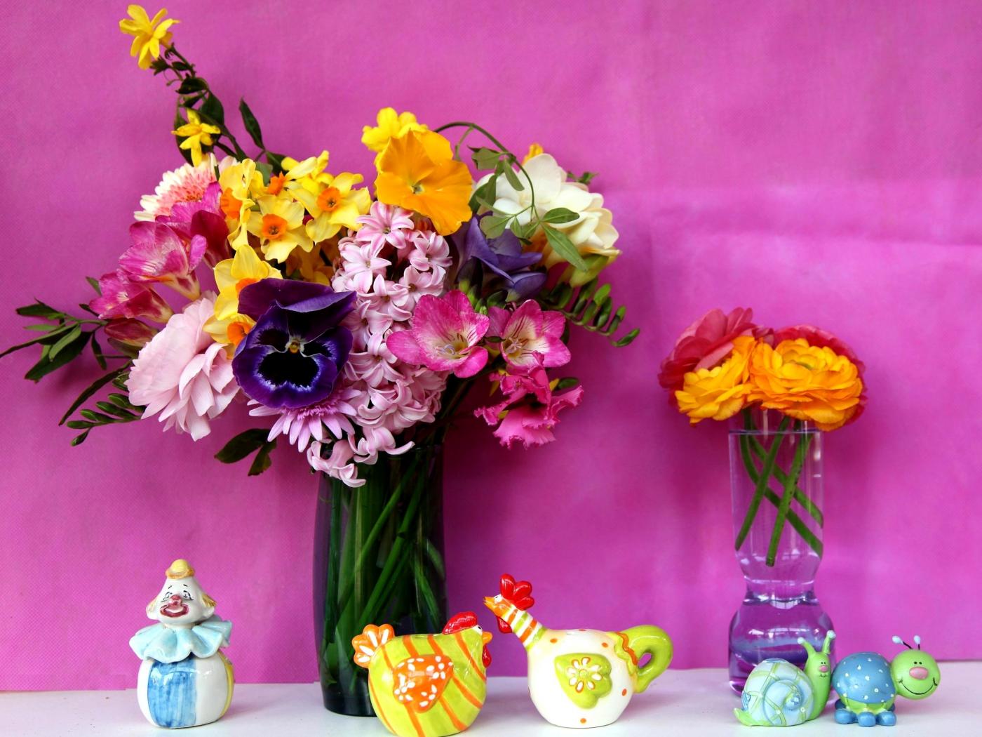 Wallpaper Bouquet of flowers in a glass vase on a violet background