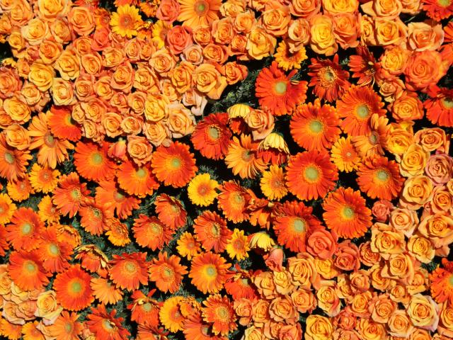 Wallpaper Orange roses and gerberas top view