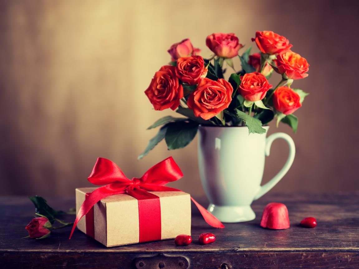 Wallpaper A bouquet of roses in a white vase with a gift on the table