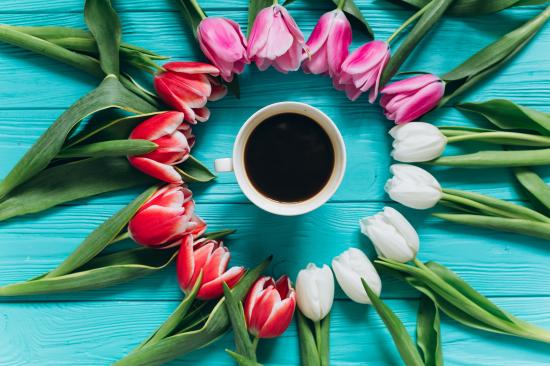 Wallpaper Bouquet of tulips with a cup of coffee on a blue background