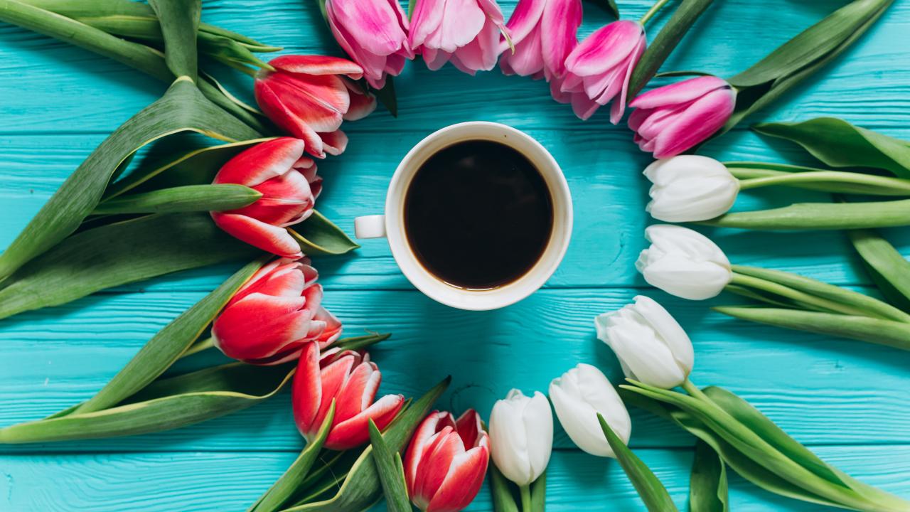 Wallpaper Bouquet of tulips with a cup of coffee on a blue background