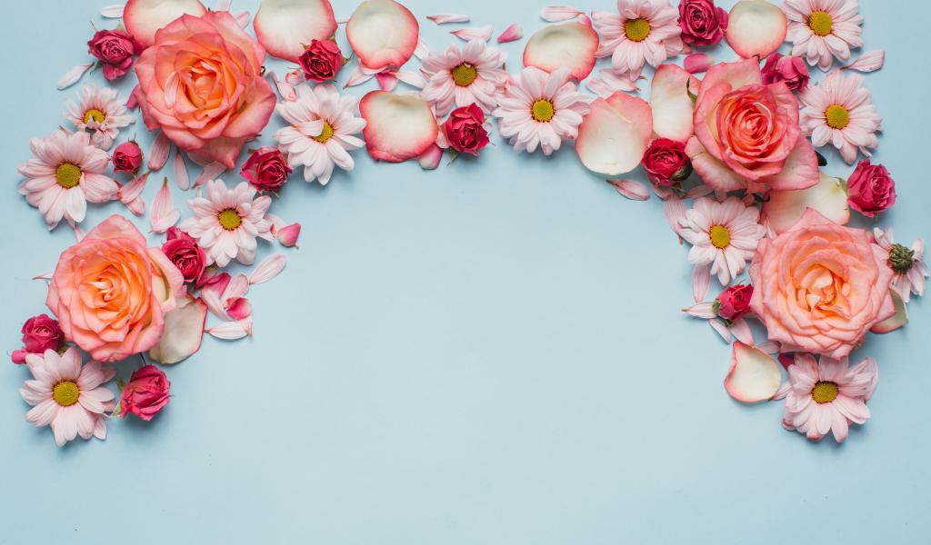 Wallpaper Pink roses and chrysanthemums on a blue background