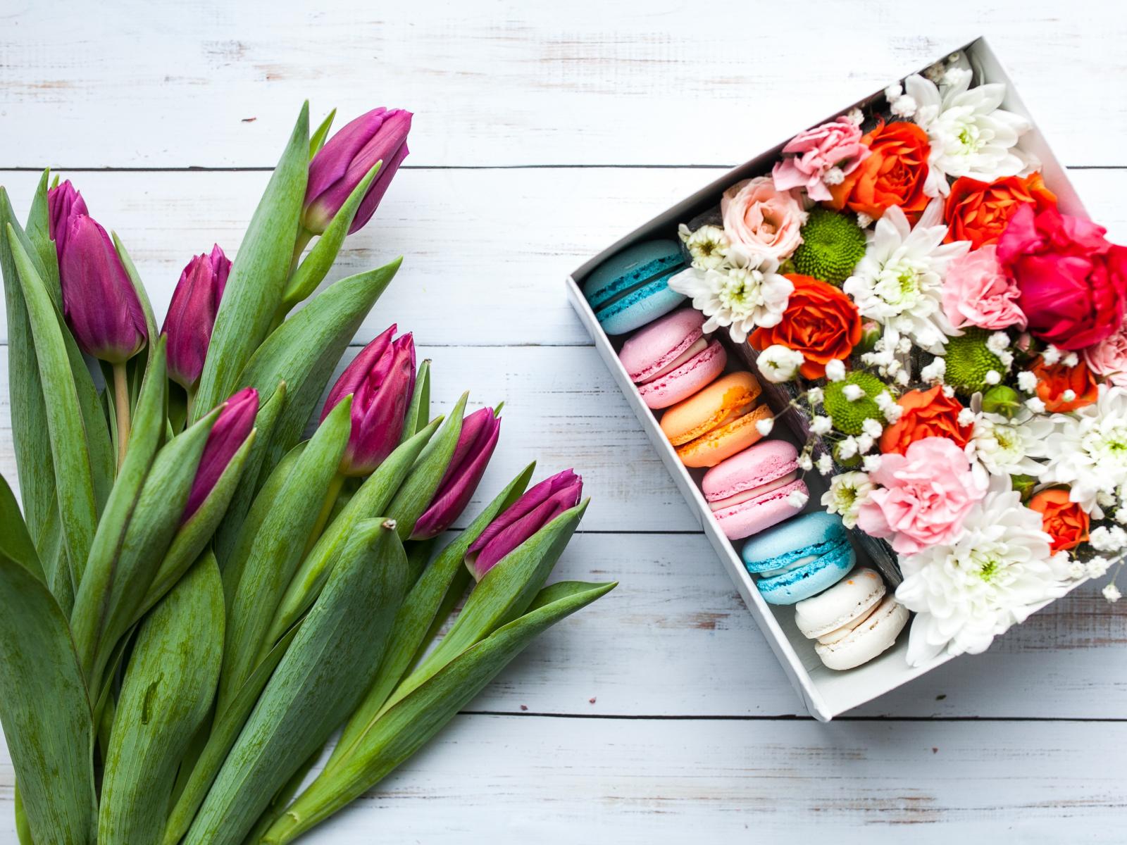 Wallpaper Bouquet of lilac tulips on a table with a box with macaroons
