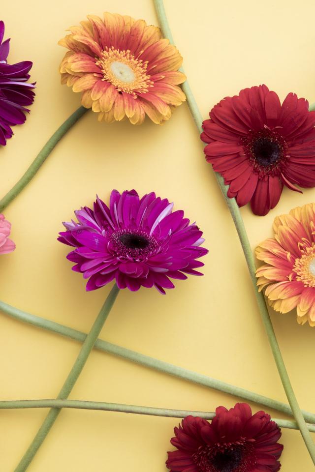 Wallpaper Multicolored gerbera on a yellow background