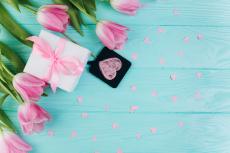 Wallpaper Bouquet of pink tulips on a table with a cup of coffee and a gift