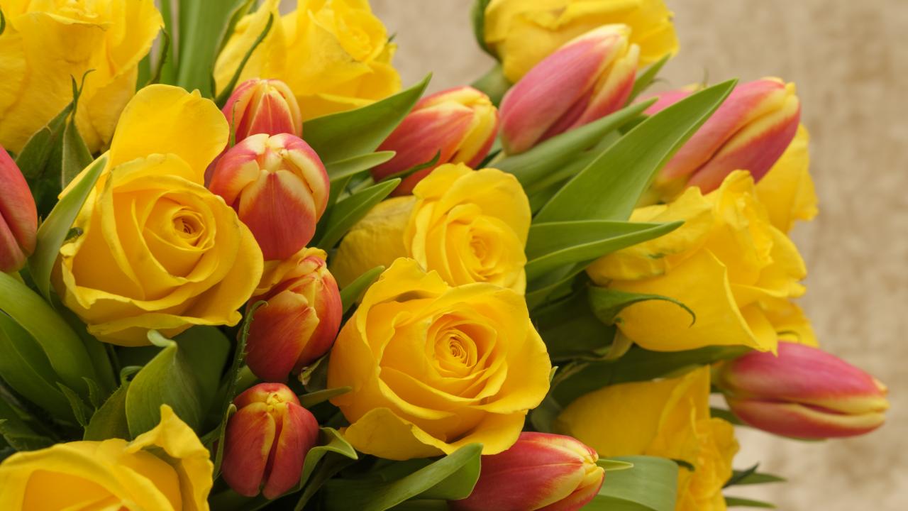 Wallpaper Bouquet of yellow roses with tulips