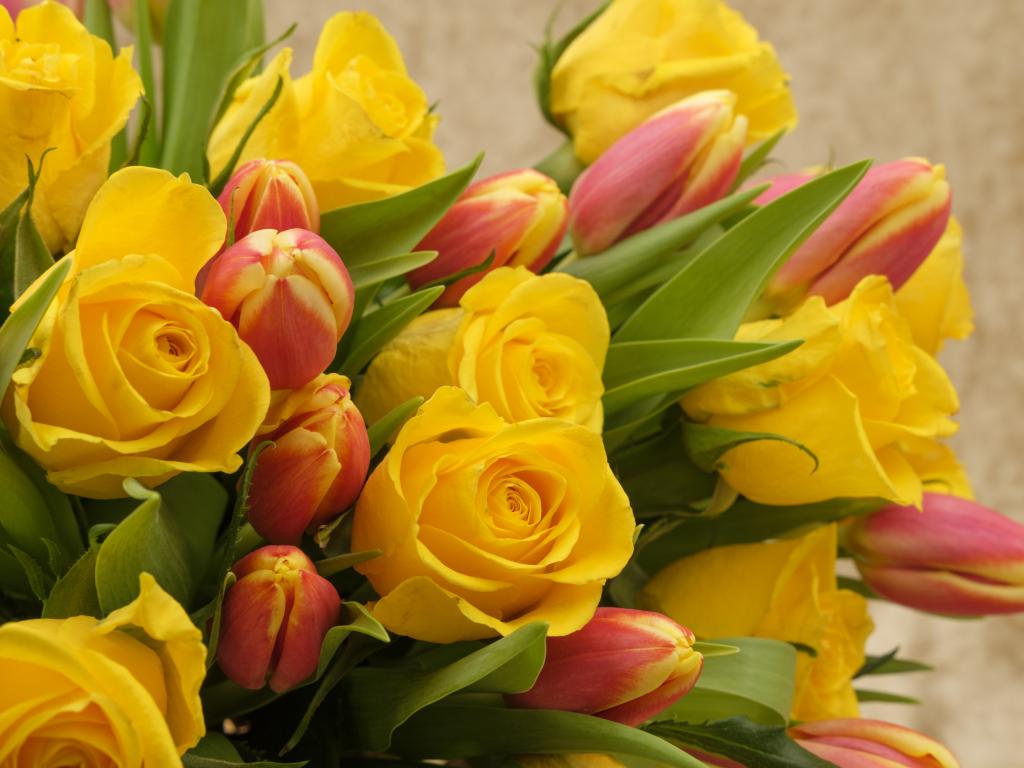 » Wallpaper Bouquet of yellow roses with tulips