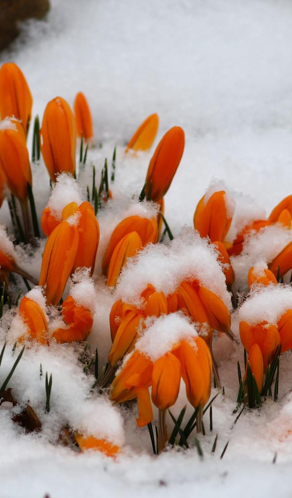 Wallpaper A field of multicolored crocuses against the background of snow-capped mountains