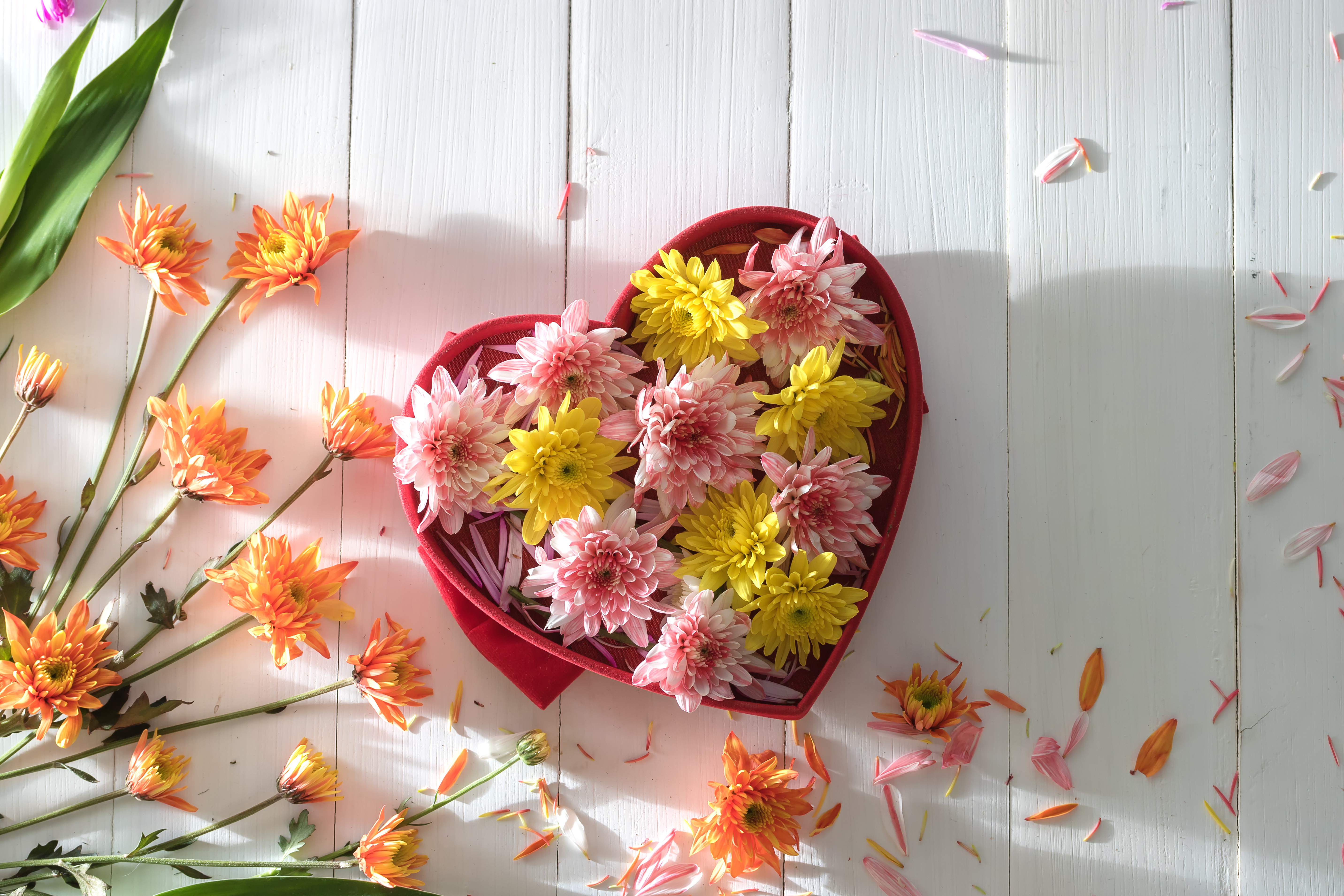 Wallpaper Box in the shape of heart with chrysanthemum flowers