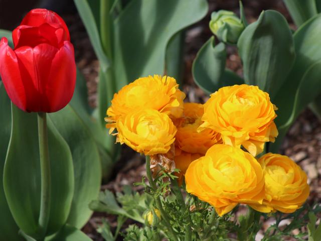 Wallpaper Red tulip and yellow buttercups on the flowerbed