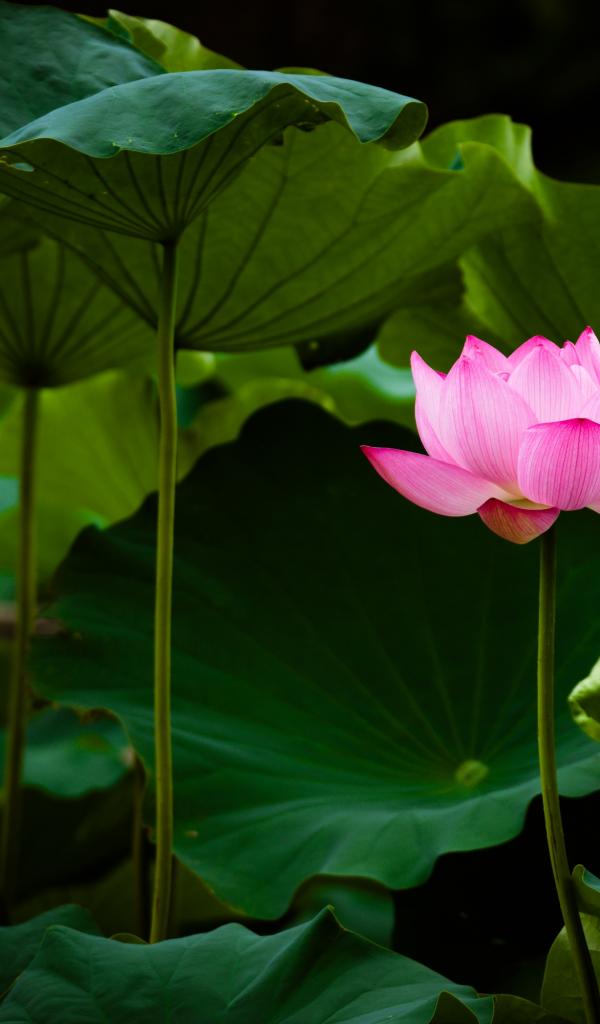 Wallpaper Delicate pink lotus flower in green leaves