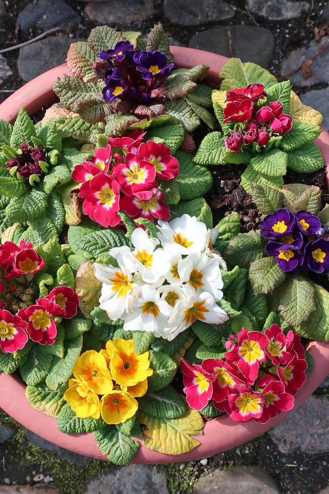 Wallpaper Multicolored flowers of primroses on a flower bed