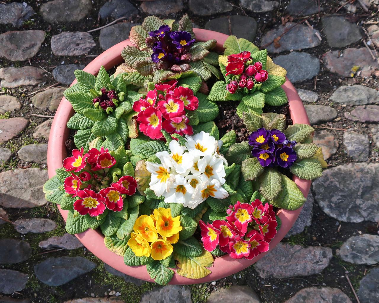 Wallpaper Multicolored flowers of primroses on a flower bed