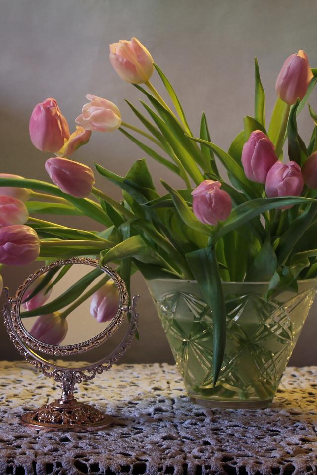 Wallpaper Pink tulips in a glass vase on a table with a mirror