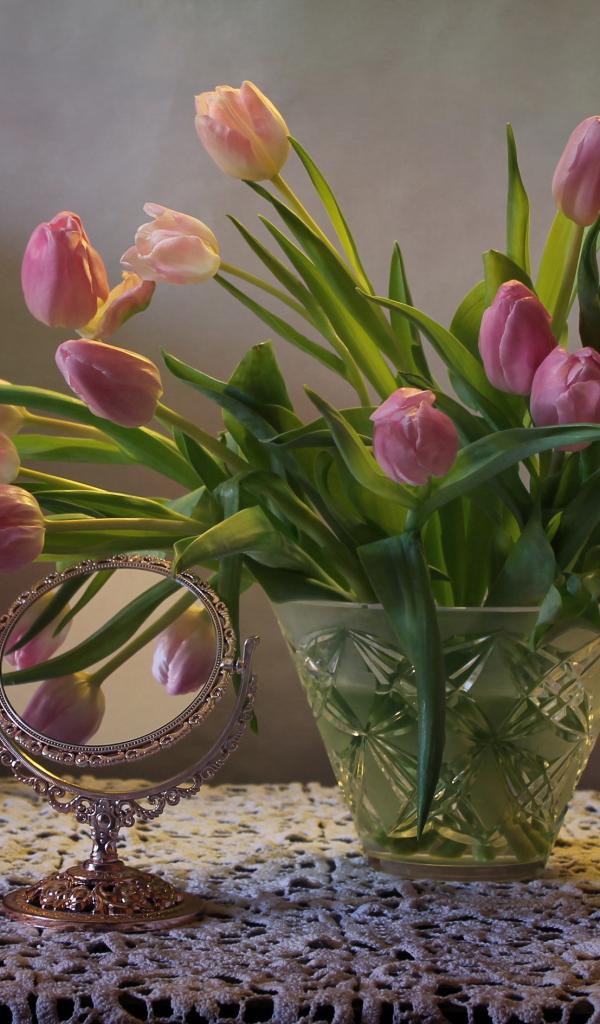 Wallpaper Pink tulips in a glass vase on a table with a mirror