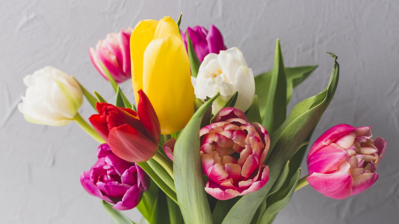 Wallpaper Bouquet of beautiful multi-colored tulips against the wall