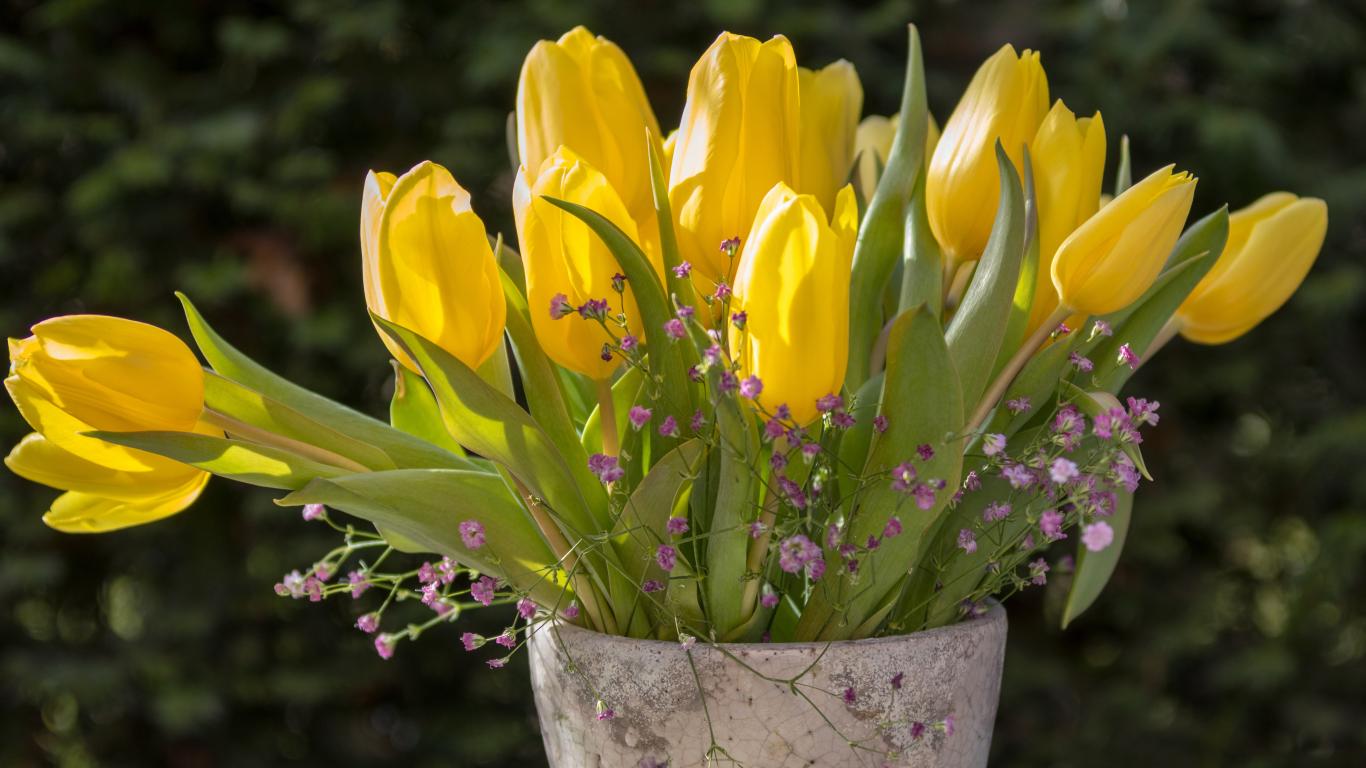 Wallpaper Yellow tulips with gypsophila flowers in a vase