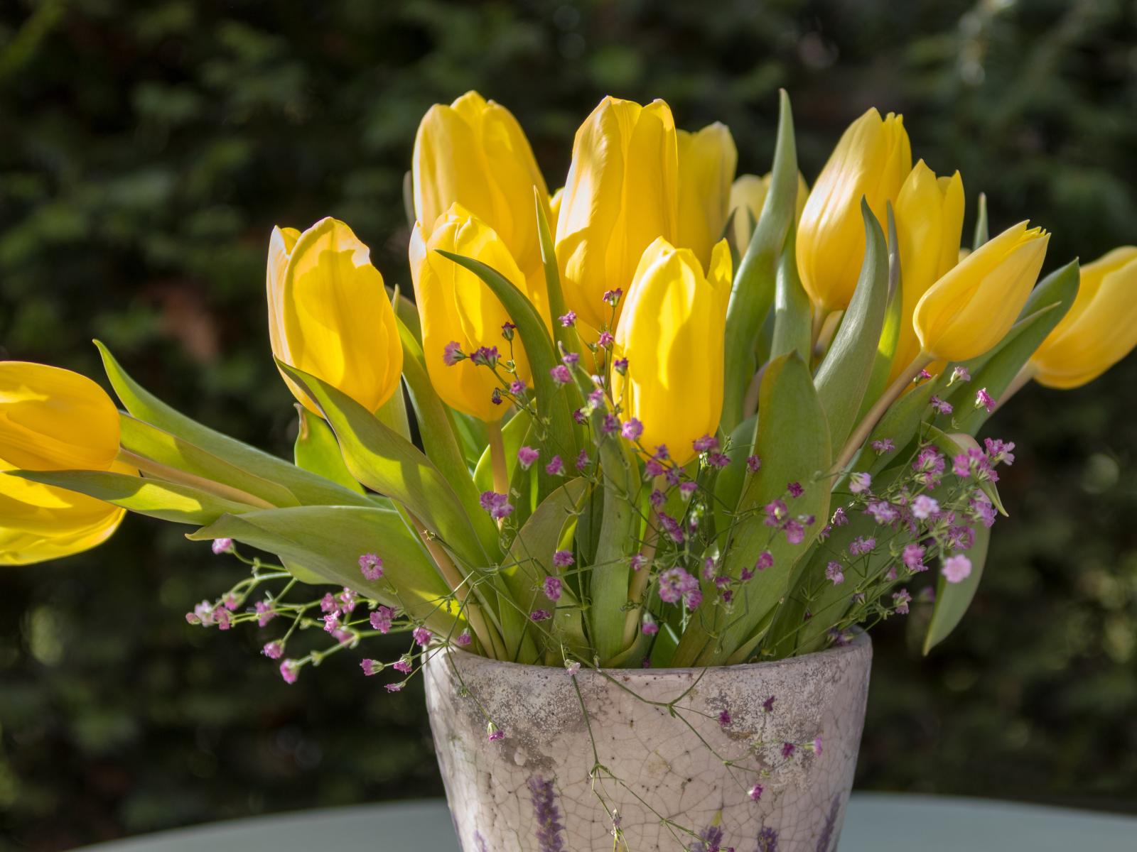 Wallpaper Yellow tulips with gypsophila flowers in a vase
