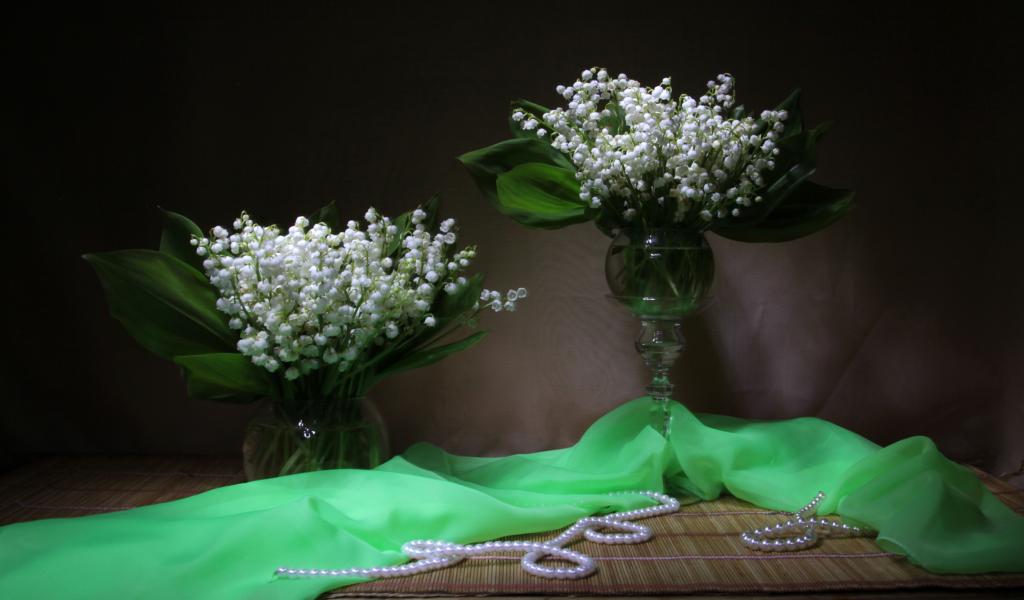 Wallpaper Two bouquets of lilies of the valley with beads on the table
