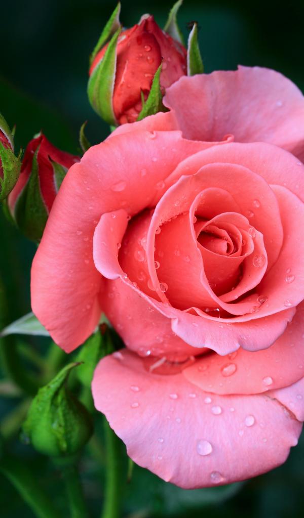 Wallpaper Pink flower of a rose with buds in drops of dew