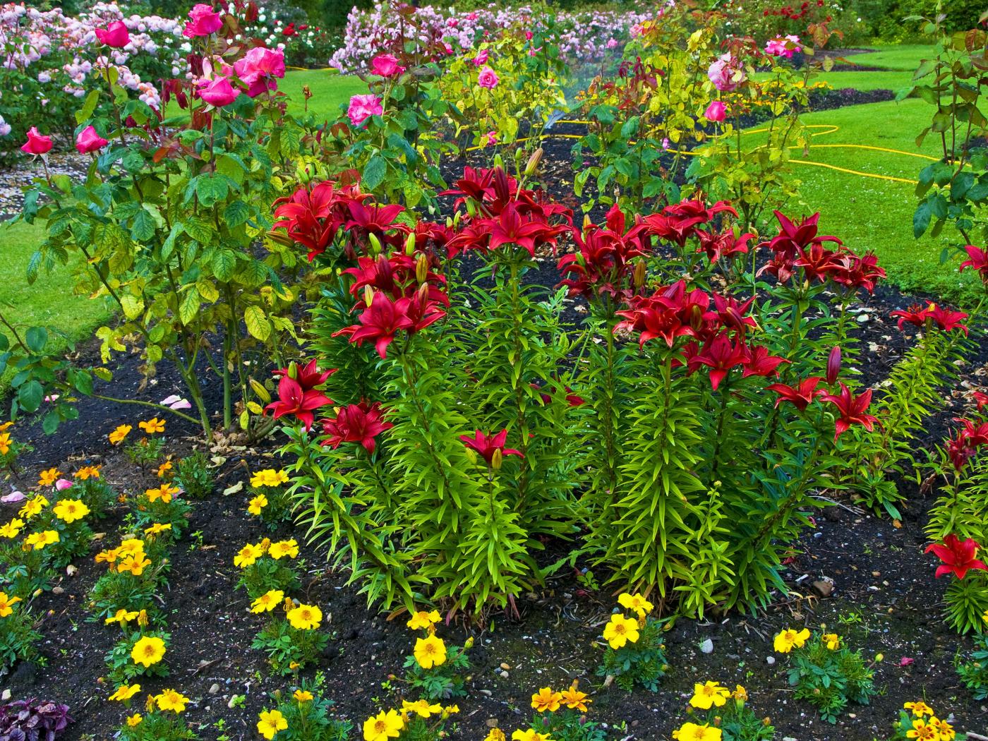 Wallpaper Red lilies and roses on the flowerbed