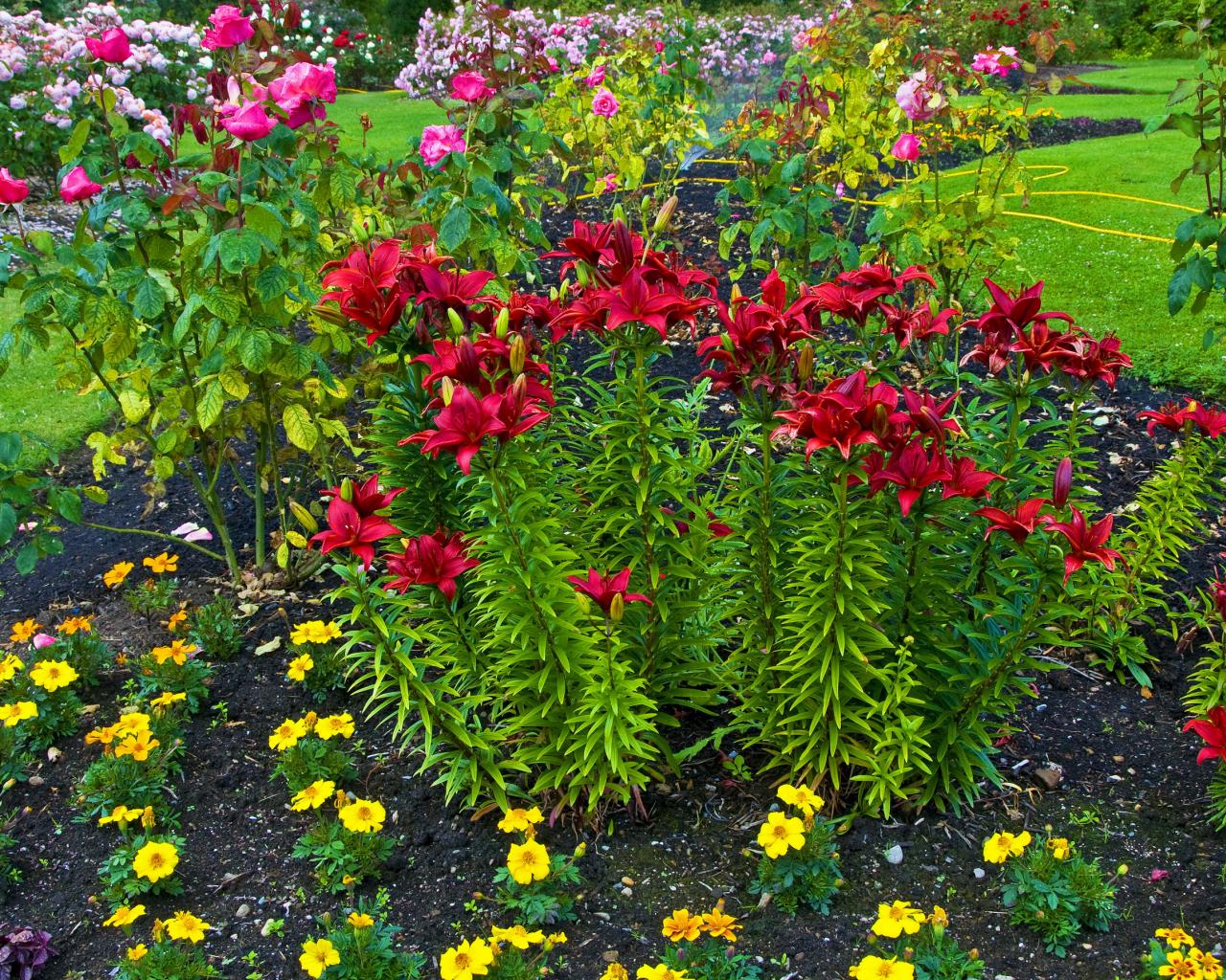 Wallpaper Red lilies and roses on the flowerbed