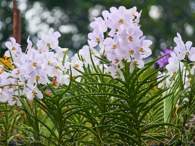 Wallpaper Beautiful white orchids on a flower bed closeup