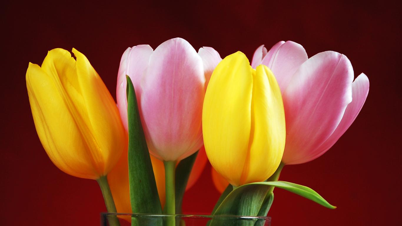 Wallpaper Bouquet of yellow and pink tulips on a red background