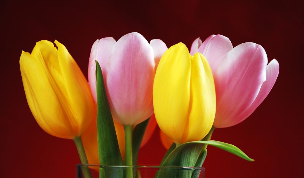 Wallpaper Bouquet of yellow and pink tulips on a red background