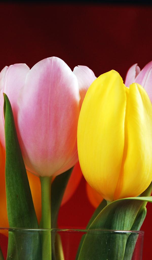 Wallpaper Bouquet of yellow and pink tulips on a red background