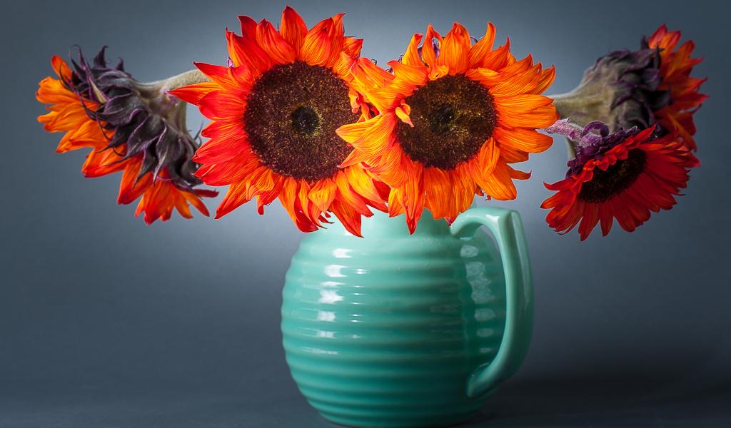Wallpaper Bouquet of sunflowers in a blue vase on a gray background