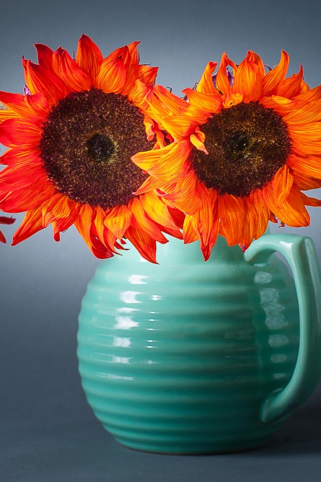 Wallpaper Bouquet of sunflowers in a blue vase on a gray background