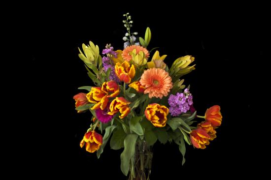 Wallpaper Bouquet of tulips with gerbera flowers on a black background