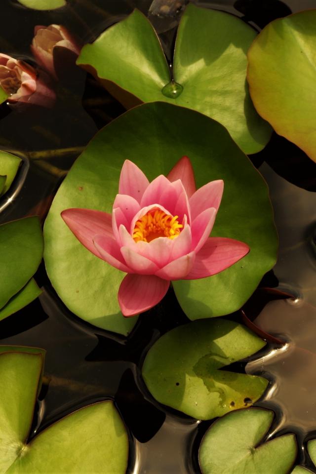 Wallpaper Delicate pink lotus flower with green leaves in water